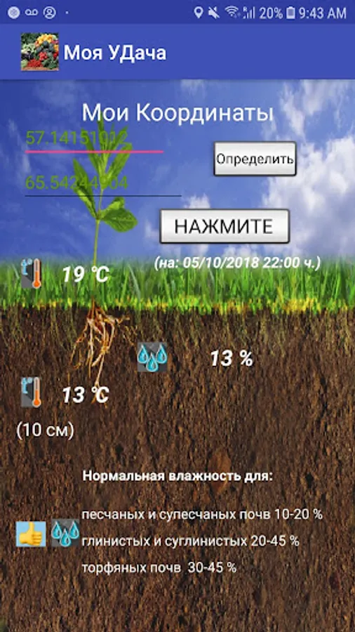 The application allows you to KNOW the temperature (on the surface, at a depth of 10 cm) and soil moisture at the user's location, as well as anywhere in the world! Always!