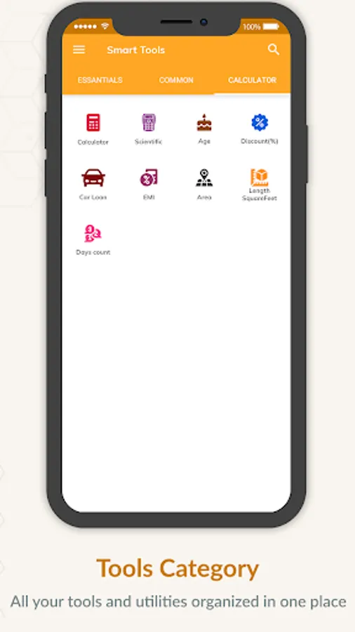 In this all in 1 toolbox there are 6 categories of utility tools: ESSENTIALS, COMMON, CALCULATOR, MUSIC, OTHER and CONVERTER.