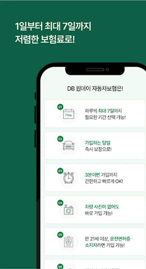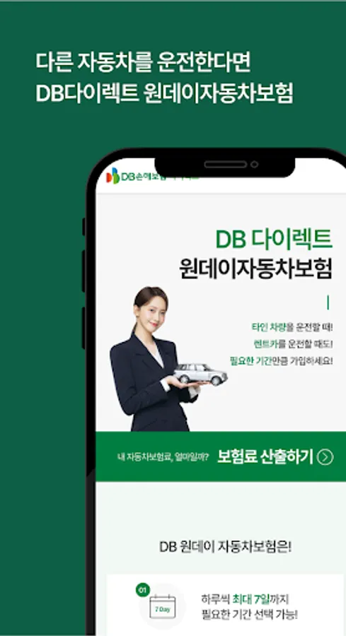 Find the one-day car insurance you need through the DB Damage Insurance Direct One-Day Car Insurance app! You can easily and quickly calculate your insurance premium with the mobile app, and offer various discounts. If you are driving someone else's vehicle or rental car, check out our one-day car insurance right now!