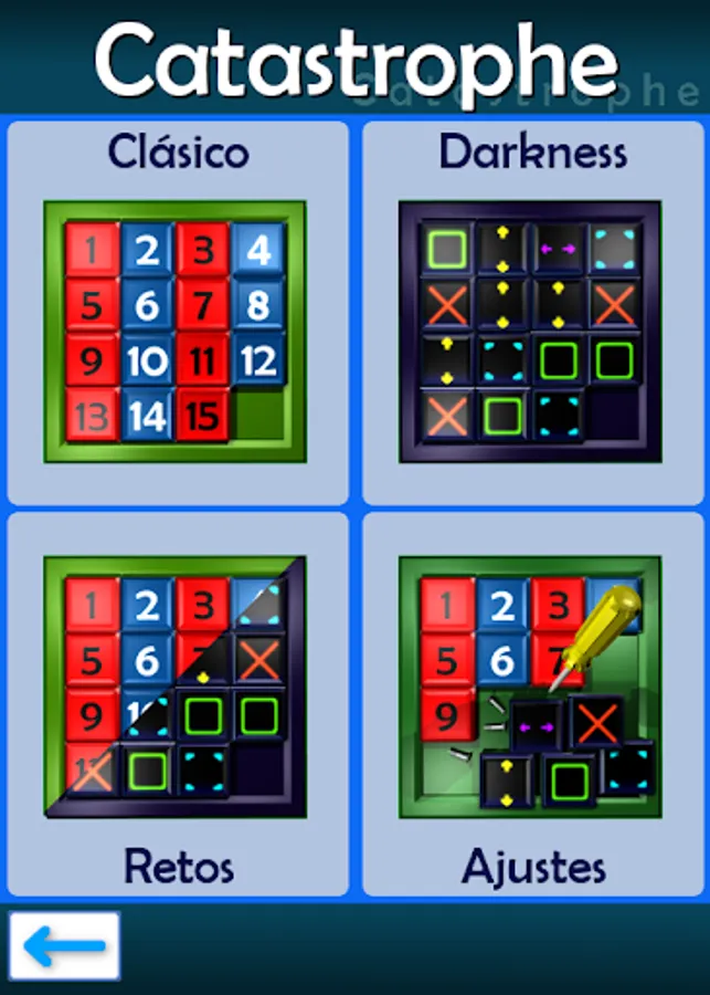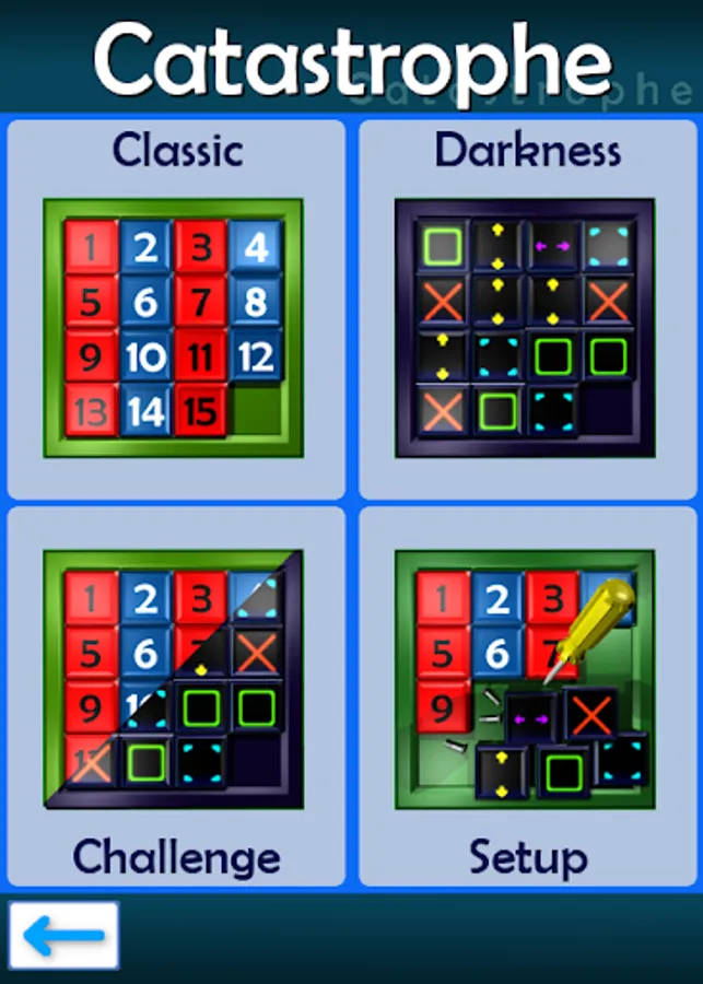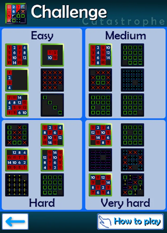 64 puzzles and three game modes: Classic - it's the game you know, 15 numbers to be sorted in a particular order. Darkness - this is Catastrophe's exclusive game mode, tiles don't show numbers but visual hints that guide you to solve the puzzle. Challenge - Several puzzles turned into challenges by adding a time limit, moves limit, faceless tiles, and more.