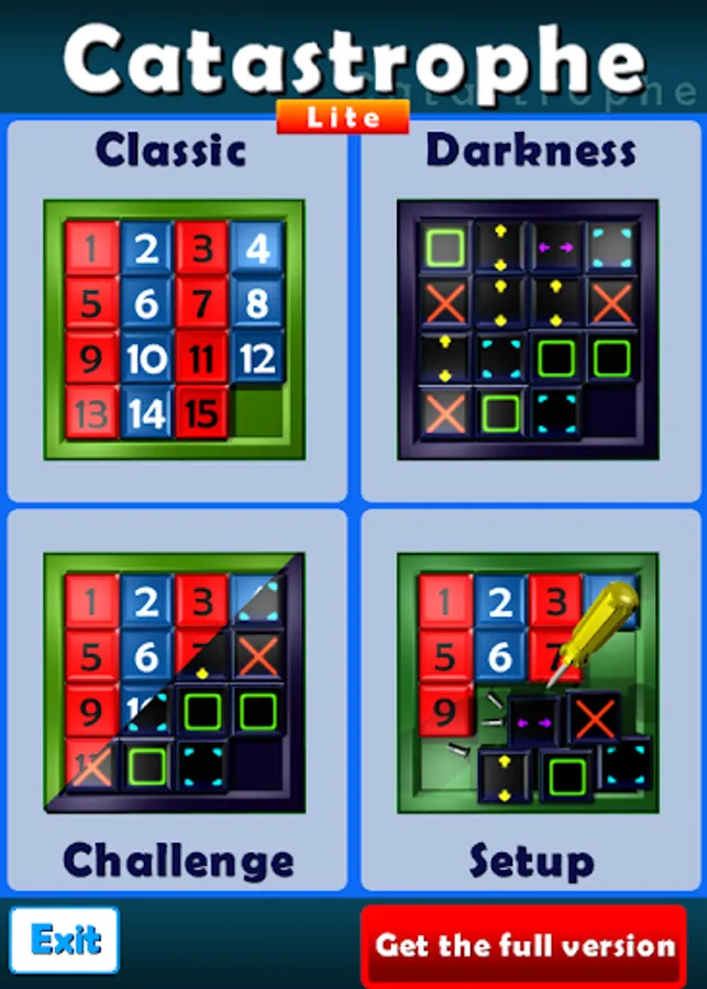 64 puzzles and three game modes: Classic - it's the game you know. 15 numbers to be sorted as shown. Darkness - this is Catastrophe's exclusive game mode, tiles don't show numbers but visual hints that guide you to solve the puzzle. Challenge - Several puzzles turned into challenges by adding a time limit, moves limit, faceless tiles, and more.