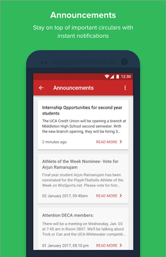 Announcements : The School management can reach out to parents, teachers and students all at once about important circulars. All users will receive notifications for these announcements. Announcements can contain attachments like images, PDF, etc.,