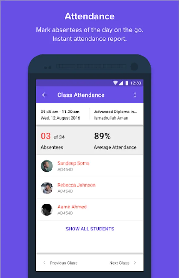 Mark Attendance : You can mark attendance right from the classroom with your mobile. It is easier than ever to mark the absentees and access the attendance report of a class.