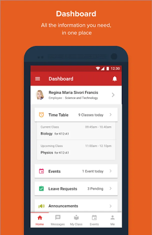 Fees : No more long queues. Now you can pay your school fees instantly on your mobile. All the upcoming fee dues will be listed in the events and you will be reminded with push notifications when the due date is getting closer.