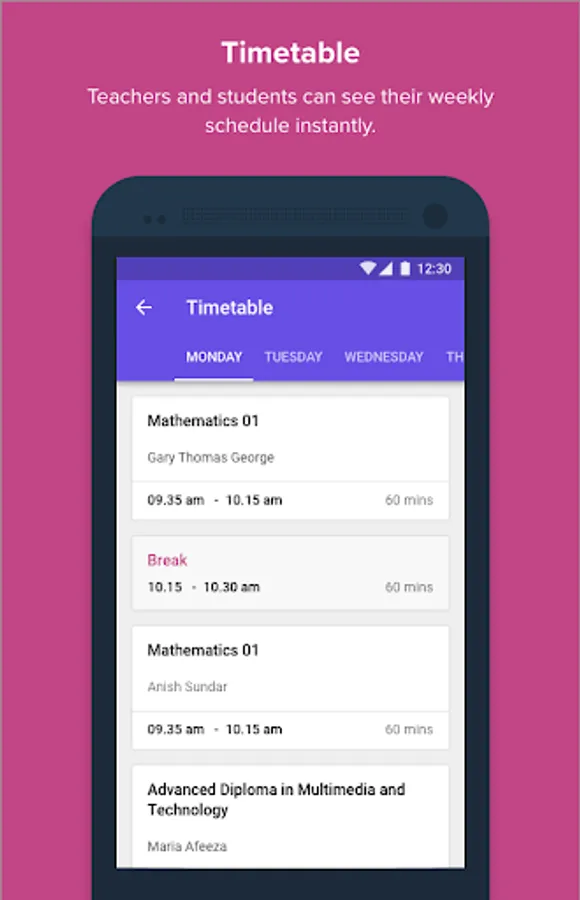 Teacher Timetable : No more shuffling your notebook to find your next class. This app will show your upcoming class in the dashboard. This weekly timetable will help you plan your day effectively.