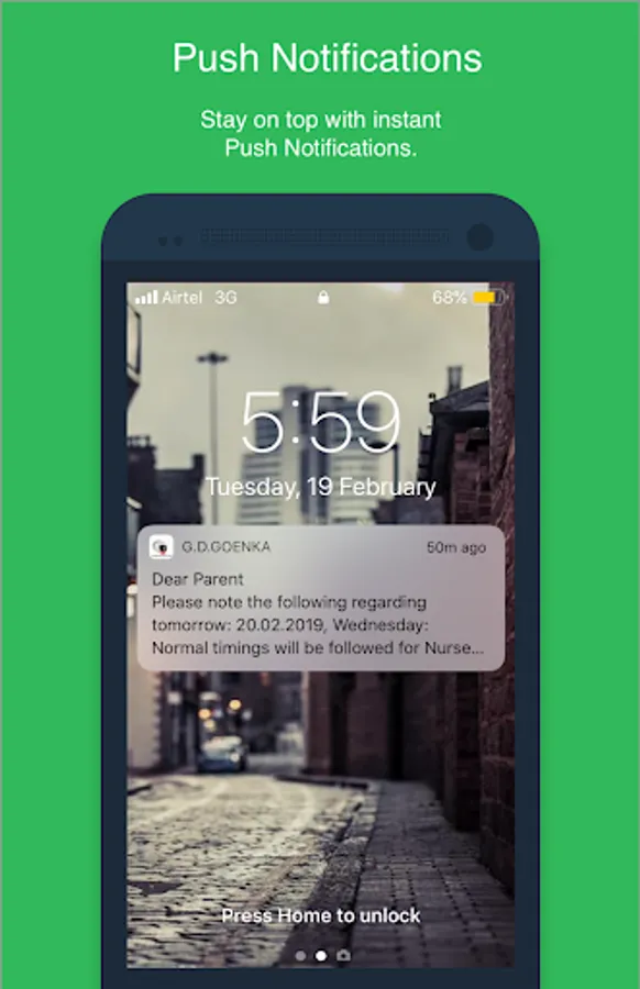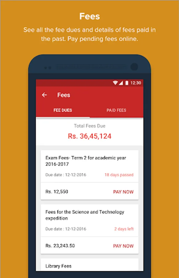 Fees: No more long queues. Now you can pay your school fees instantly on your mobile. All the upcoming fee dues will be listed in the events and you will be reminded with push notifications when the due date is getting closer.