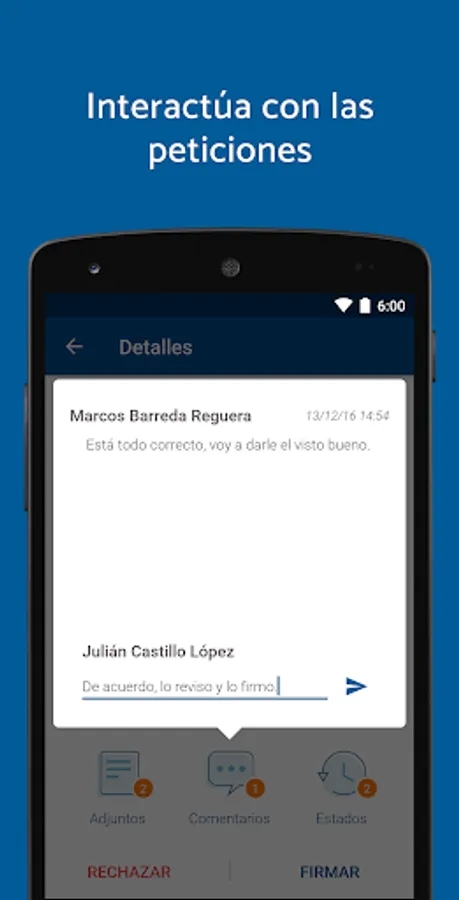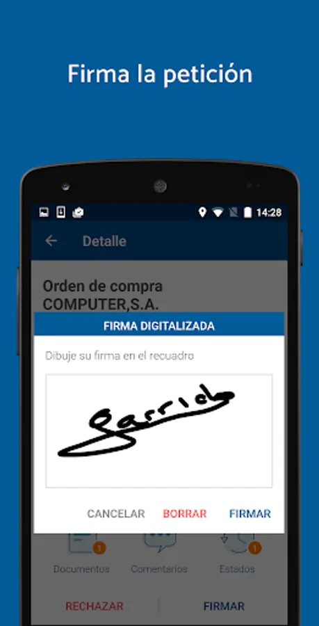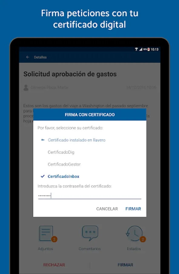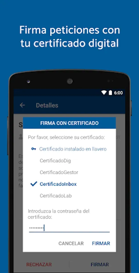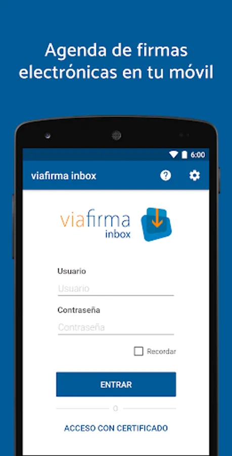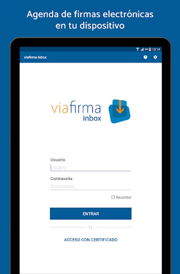 With the native viafirma inbox Android application you will be able to manage your inbox and electronically sign your documents from your mobile device. You could access the application by using user and password or your digital certificate installed in your mobile device. Besides, you will be able to: