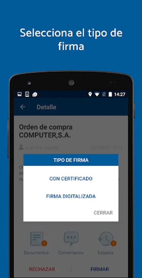 • Electronically sign your documents by following the next flows: Serial signature (cascade), Parallel Signature, In line Signature, Approval Option.