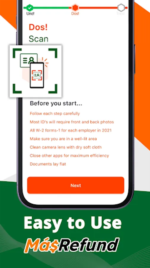 MásRefund is the world's fastest, easiest and most accurate tax-filing solution using Al/ML. It’s as easy as Uno, Dos, Tres! Five minutes from start to finish. With the subscriber's attestation that their data provided is truthful and accurate, MásRefund prepares and files the return with the IRS.
