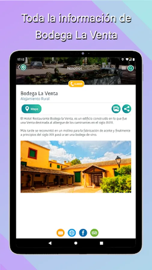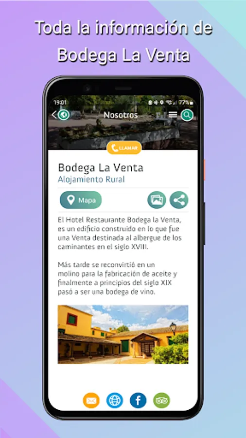 With our app you will be able to see first-hand a guide in digital format configured as a virtual tourist office about Hotel Bodega La Venta and its surroundings, GPS-guided routes, nature, activities and special itineraries, gastronomic, cultural and leisure proposals.