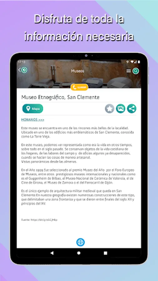 It also has a system that will allow you to mark all your favorite options to better plan your vacation. With our Hotel Bodega La Venta guide you can find the best places in the area. Through its resource search engine you can write what you are looking for and the app will inform you in each case where you can find it.