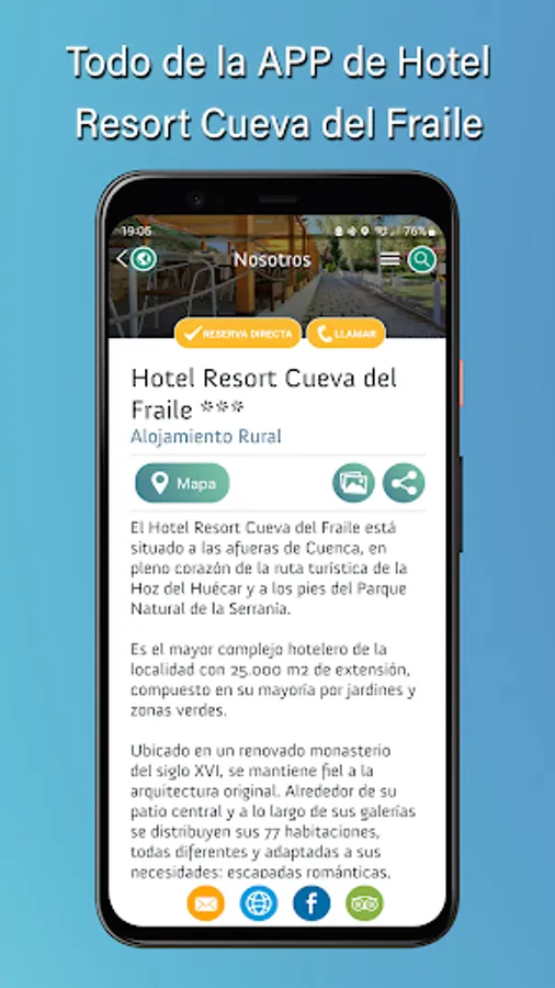 It also has a system that will allow you to mark all your favorite options to better plan your vacation. With our Cueva del Fraile Hotel Resort guide you can find the best places in the area. Through its resource search engine you can write what you are looking for and the app will inform you in each case where you can find it.