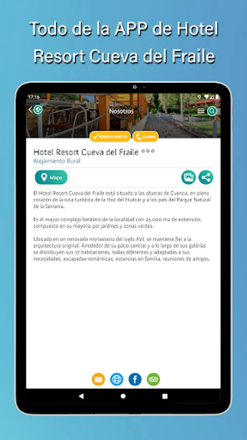 With our app you will be able to see first-hand a guide in digital format configured as a virtual tourist office about Hotel Cueva del Fraile and its surroundings, GPS-guided routes, nature, activities and special itineraries, gastronomic, cultural and leisure proposals.