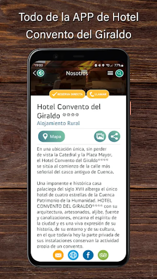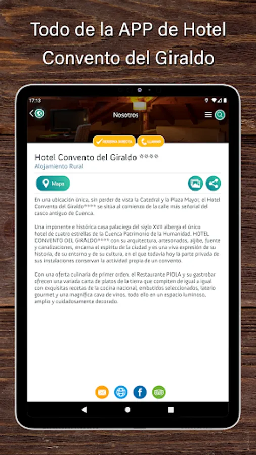 It also has a system that will allow you to mark all your favorite options to better plan your vacation. With our Hotel Convento del Giraldo guide you can find the best places in the area. Through its resource search engine you can write what you are looking for and the app will inform you in each case where you can find it.
