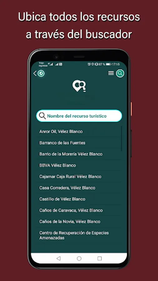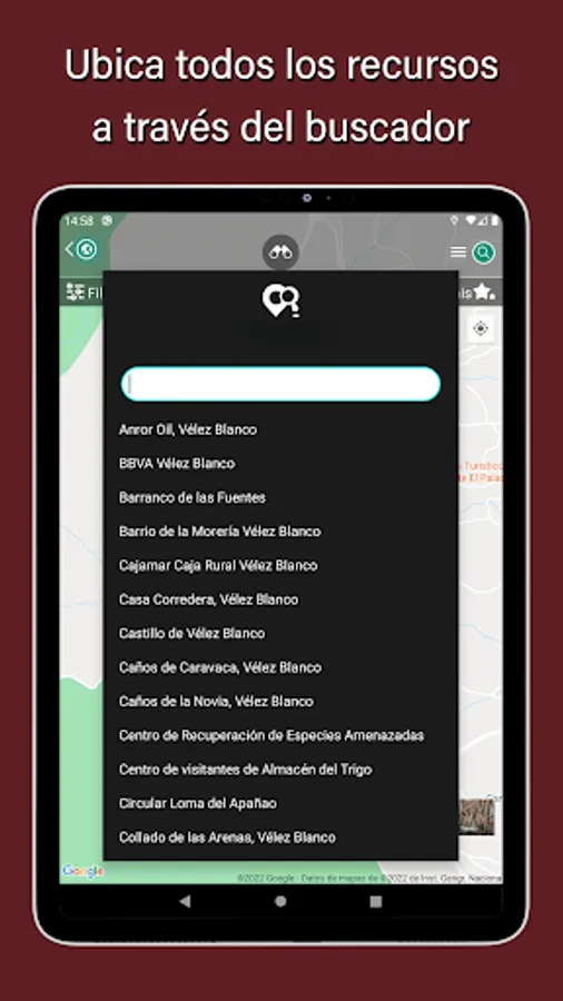 With our Vélez Blanco guide, you will be able to find the best places in the area. Through its resource search engine you can write what you are looking for and the app will inform you in each case where you can find it.