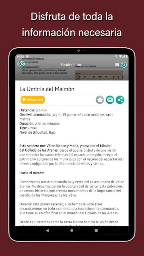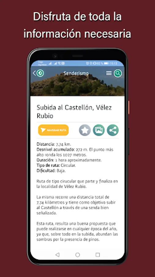 With "Discover Vélez Blanco" you will be able to navigate hiking or biking routes and even motorcycle routes through its GPS navigation system.