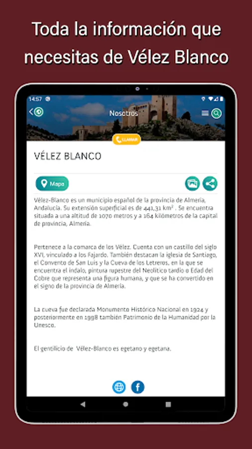And all this can be used without an Internet connection. Once downloaded for the first time, you will have all the resources without wifi or mobile data. You can use "Discover Vélez Blanco" anywhere without coverage and without fear of losing your information.