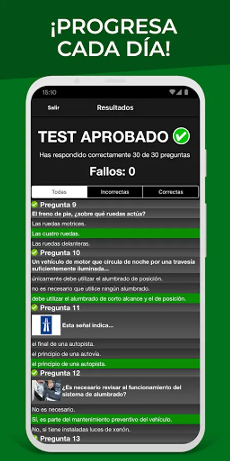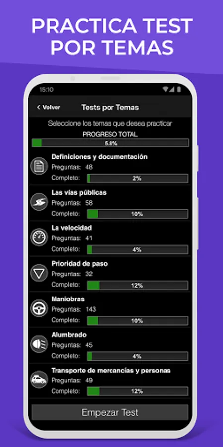 The application saves a history not only of each test you take but of each question. This allows us to offer you the best statistics system since you will know at all times the real percentage of your knowledge of each subject.