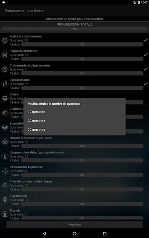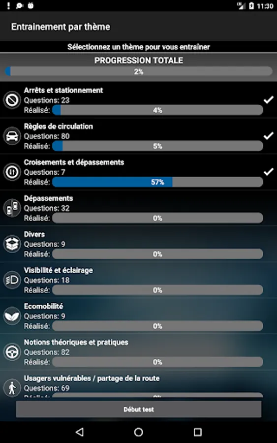 You can select one or more categories to practice. You can also practice quick tests of 10, 20 or 30 questions. In this section, there is no time limit to answer and you can consult the explanations before choosing the right answer.