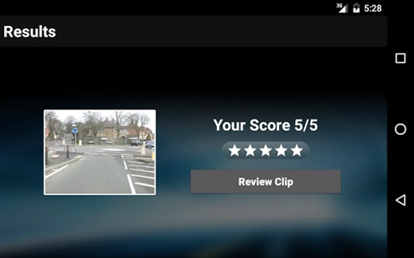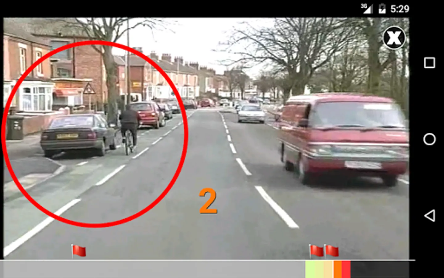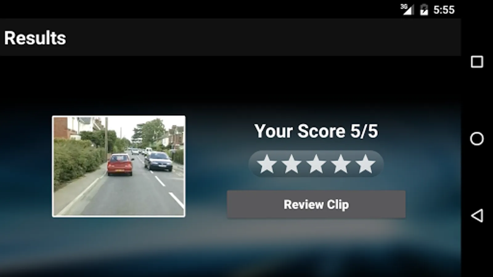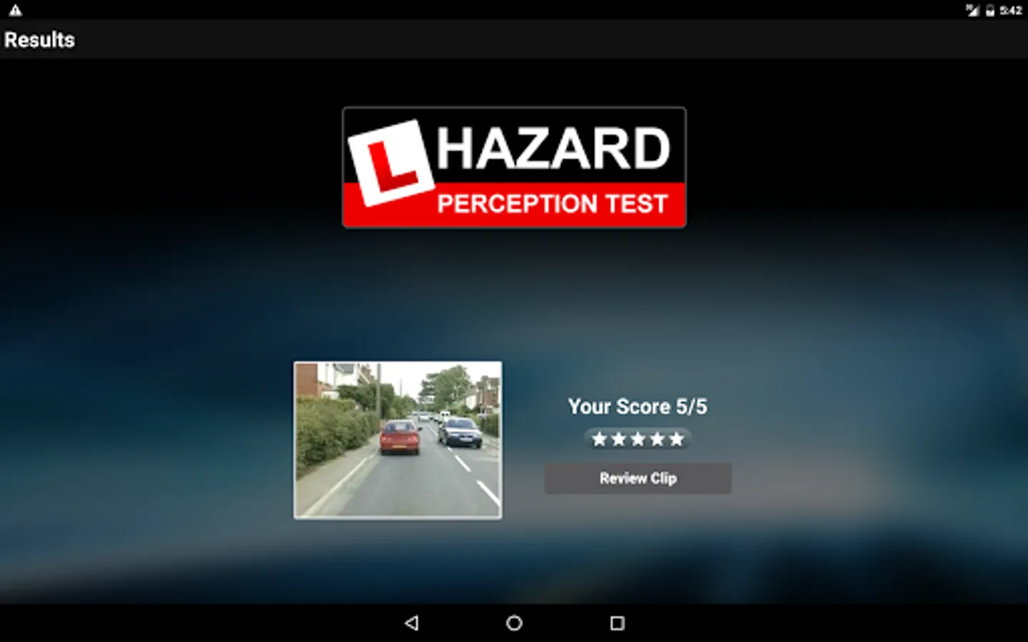 This application reproduces the experience of the real test. You identify the correct hazard by touching the screen on your device. The earlier you identify the hazard the more you score. The scoring goes from five to zero points. When you finish a clip you can play it in review mode to see exactly when the hazard begins and ends.
