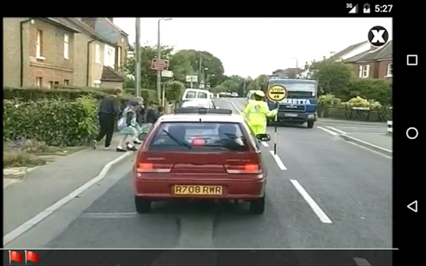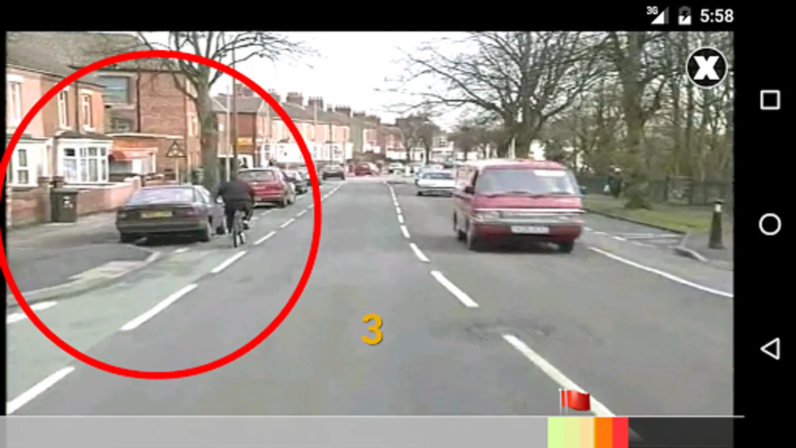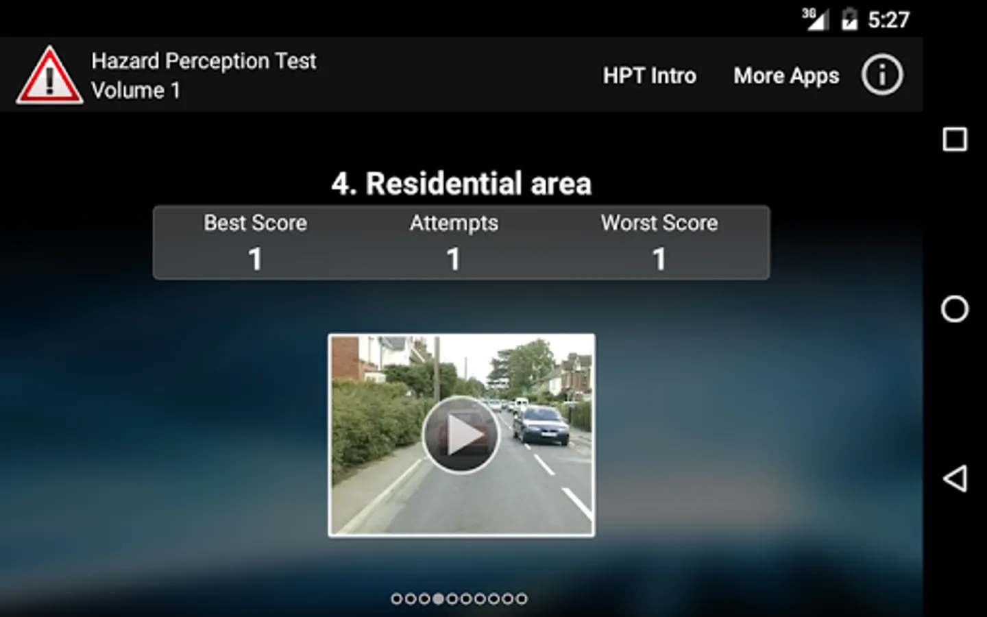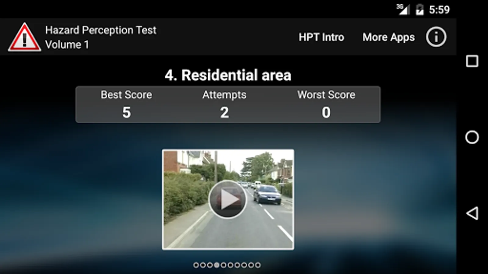 This application reproduces the experience of the real test. You identify the correct hazard by touching the screen on your device. The earlier you identify the hazard the more you score. The scoring goes from five to zero points. When you finish a clip you can play it in review mode to see exactly when the hazard begins and ends.