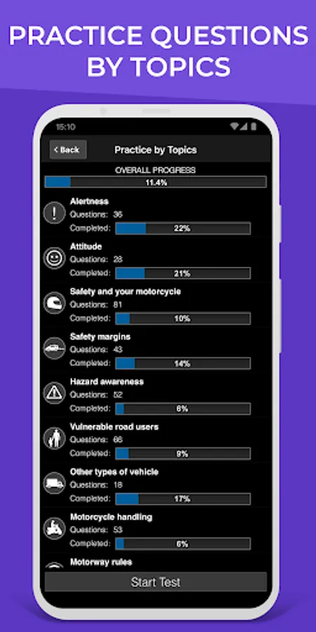 * Practice Theory Test: Test your knowledge by practicing by categories. You can select one or more categories to practice. You can also perform rapid tests for 10, 20 or 30 questions. In this section there is no time limit and you can see the explanation before selecting the correct answer.