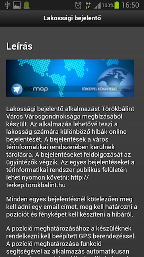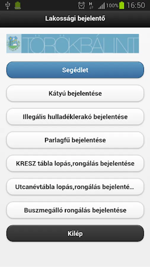 Consumer reporting application made Törökbálint City City Trust's behalf. The application allows for the public announcement of various errors online (announcement pothole reporting of illegal landfills, Ragweed announcement of a traffic sign theft, vandalism notification, street sign theft, vandalism announcement, the announcement Bus stop vandalism). The applications are stored in the city's GIS system. The notification process performed by the administrator. Each public announcements on the surface of the GIS system can be monitored: http://terkep.torokbalint.hu