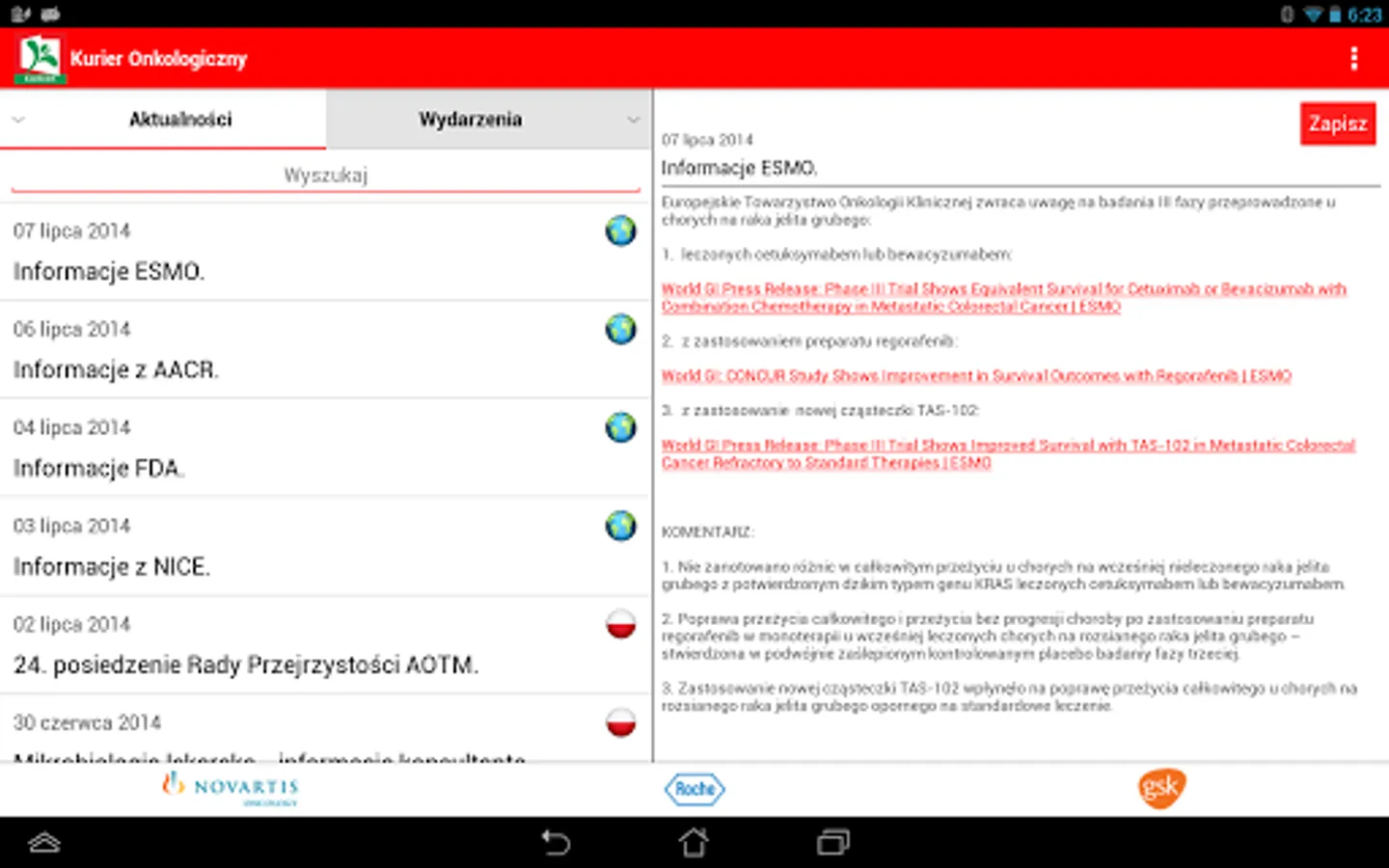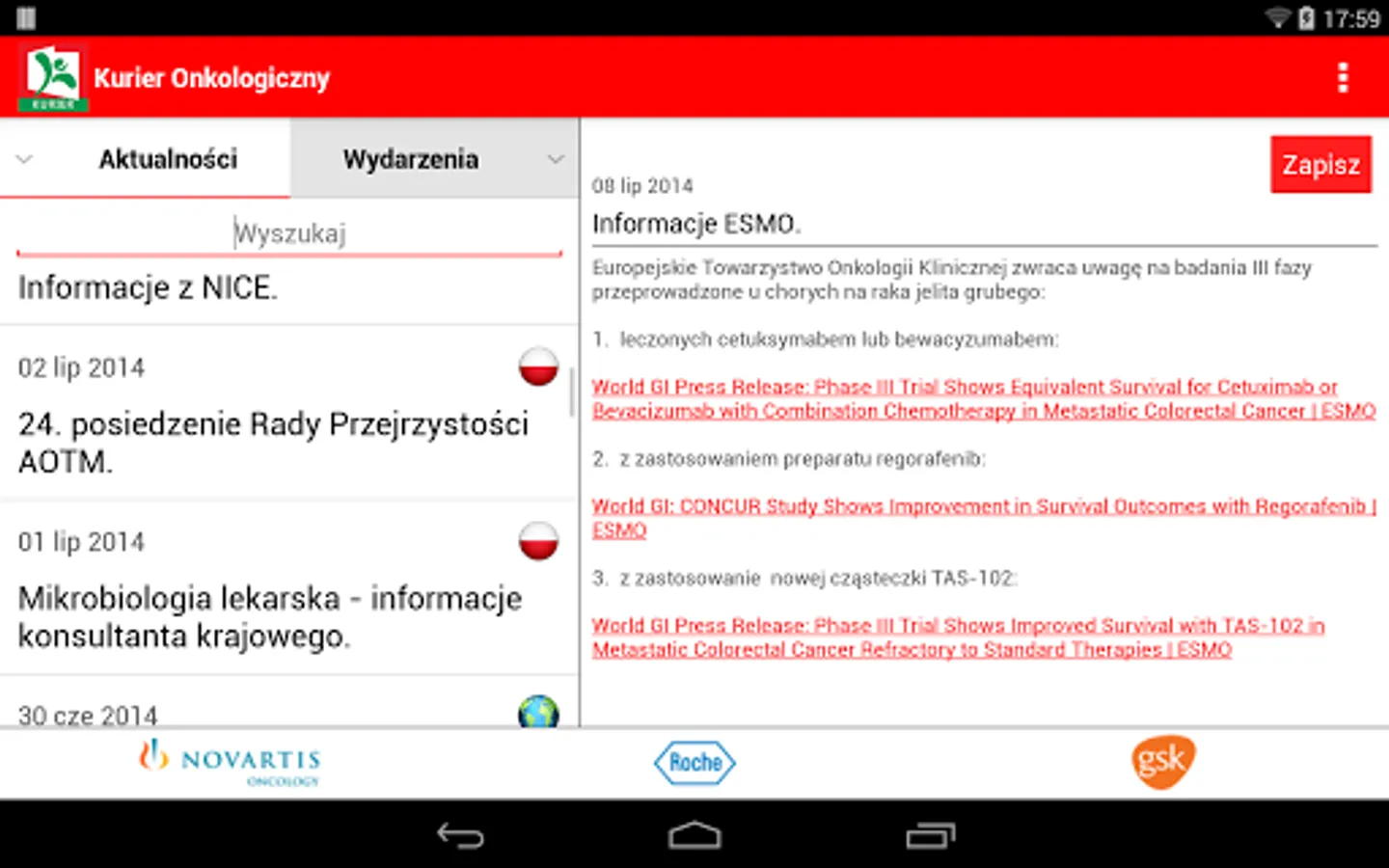 The application includes news reader, along with the ability to save selected to the clipboard and a calendar of important upcoming conferences and meetings in oncology.