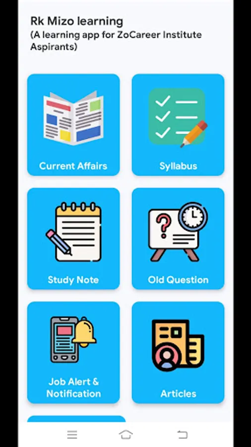 RK Mizo Learning App hi ZoCareer Institute Aspirants te tana siam ani a, he app ah hian Current Affairs, Study Note, Syllabus, Questions hlui tam tak download theiha dah ani. Tin, Job Alert hrang hrang leh Notifications a awm bakah Article bengvarthlak tak tak chhawpchhuah reng ani bawk e.