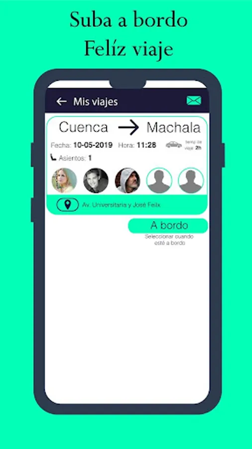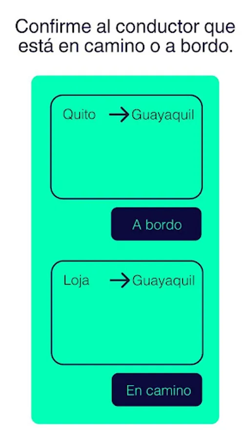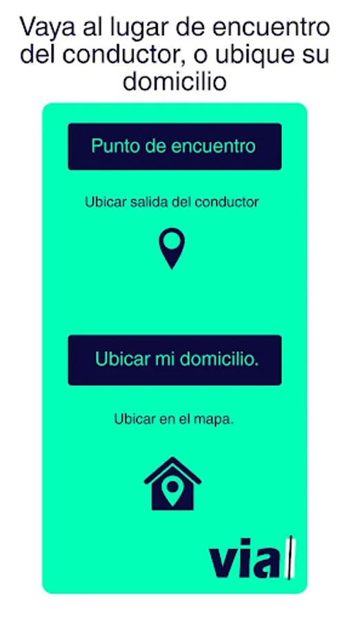 With road, if the driver selects the option to pick up at home, you can enter your address and wait for them to pass by you, and then start your trip, or, go to the place of departure of the driver, Vial allows you to travel to cities , such as: Guayaquil, Quito, Cuenca, Loja, Machala, Manta, Salinas, Santo Domingo and more