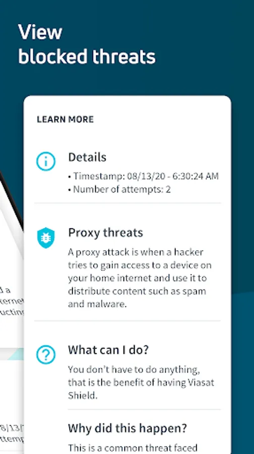 Viasat Shield protects your home internet and Wi-Fi network to defend against common online security threats like botnets, trojans, and more. Our easy-to-use service actively monitors and blocks suspicious activity so you can keep your private information private, guard against cyberattacks, and help keep your devices clean from viruses and malware.