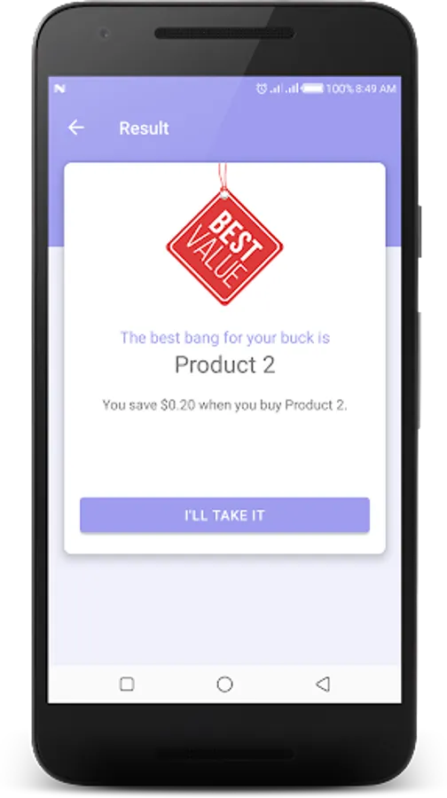 3. Press the "Best Bang for my buck" button...and the app shows you the product with the best value for your money.