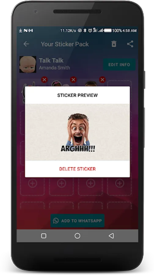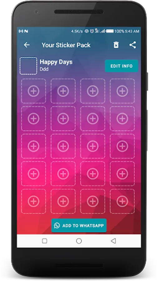 When you have created at least 1 sticker 😜 in a sticker pack, you can add to Whatsapp by clicking the "Add to WhatsApp" button. After this, your sticker pack is available for use in WhatsApp. Enjoy your chats with family and friends with your unique stickers!