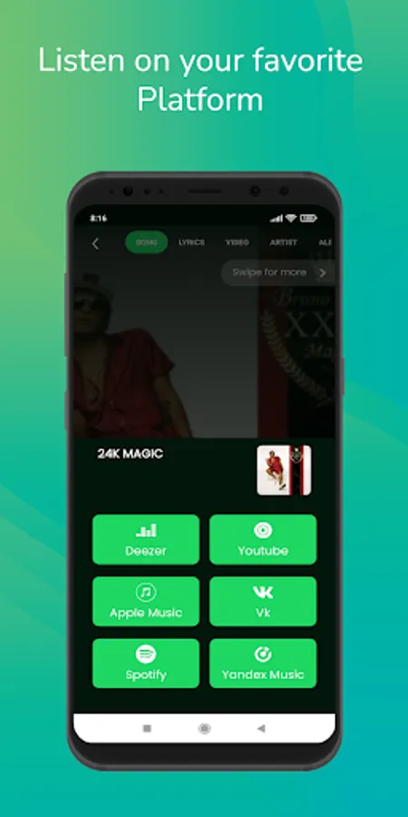 • Listen to the full song you recognized on Spotify, Apple Music, VK, and Deezer.