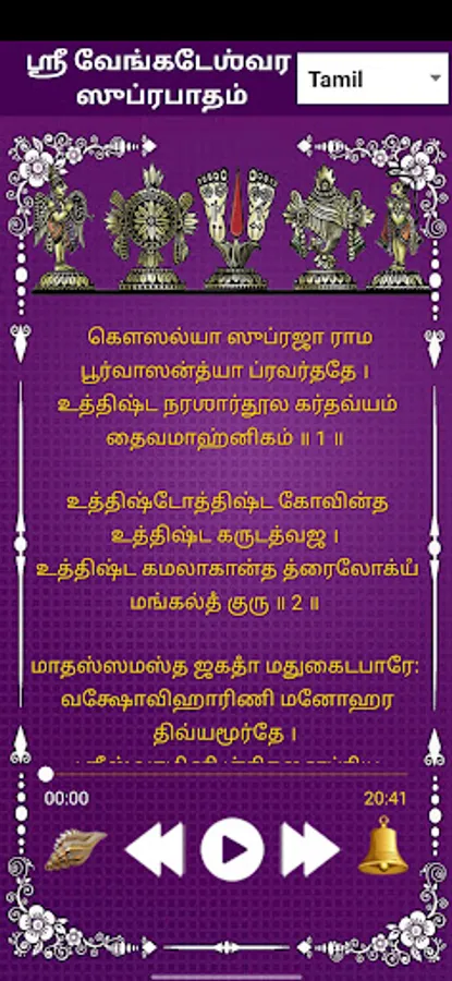 Suprabhatam in Hindi, Telugu, Tamil, Kannada, Malayalam and English.
