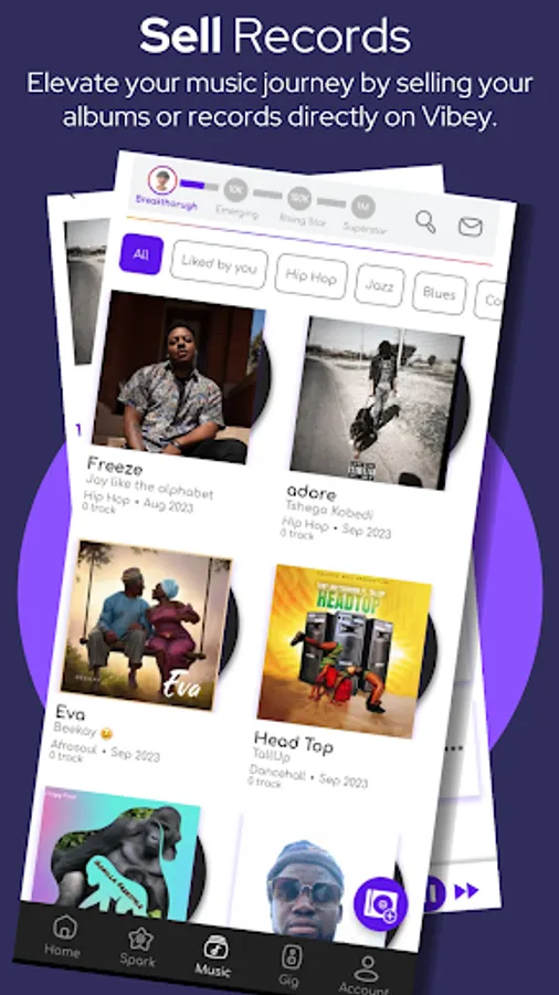 **Sell Records:** Elevate your music journey by selling your albums or records directly on Vibey. Showcase your albums to a global audience, and with easy-to-use album management tools, bring your music to the forefront of the industry.