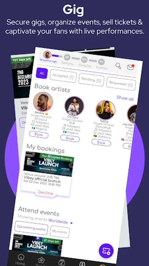**Gig:** Spotlight your talent with Vibey. Secure gigs, organize events, and captivate your fans with live performances. From virtual concerts to local gigs, Vibey empowers you to connect deeply with your audience and cultivate a dedicated fan base.
