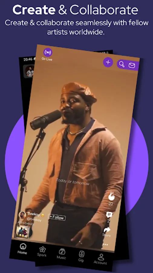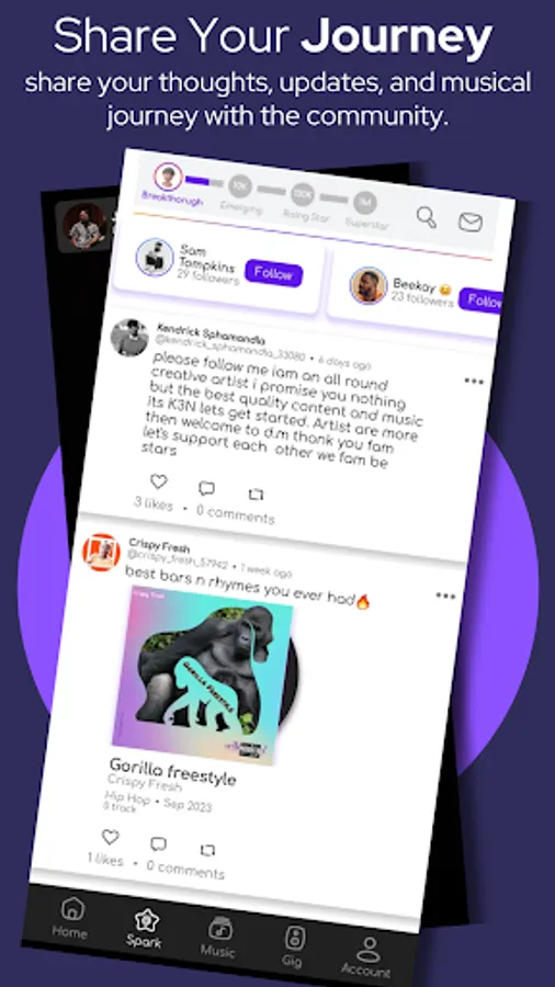 **Share Your Journey:** Dive into Vibey's "Spark" feature and share your thoughts, updates, and musical journey with the community. Engage with fellow musicians, producers, and fans, fostering meaningful connections and inspiring collaborations.