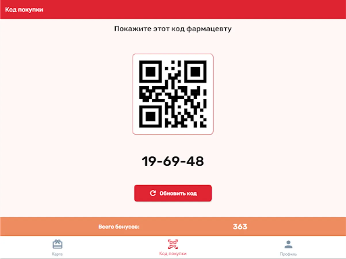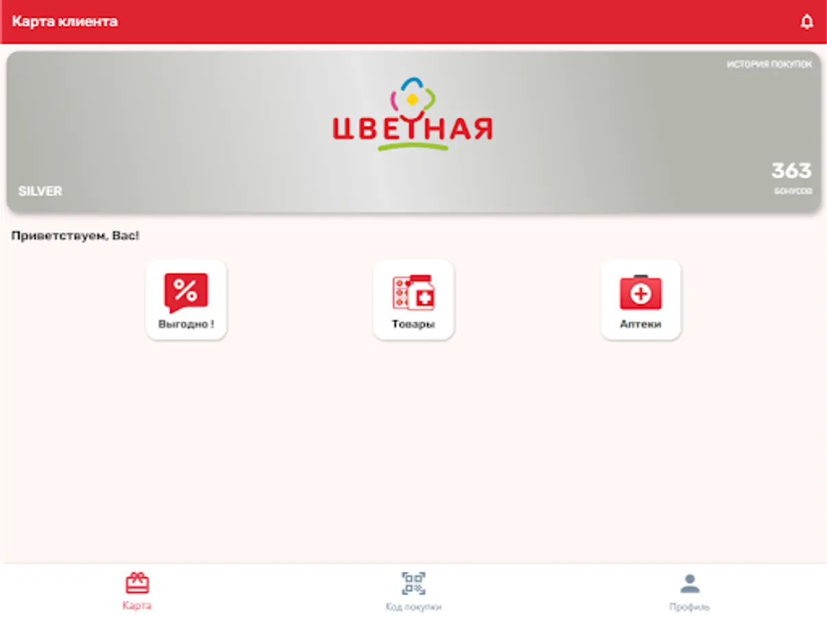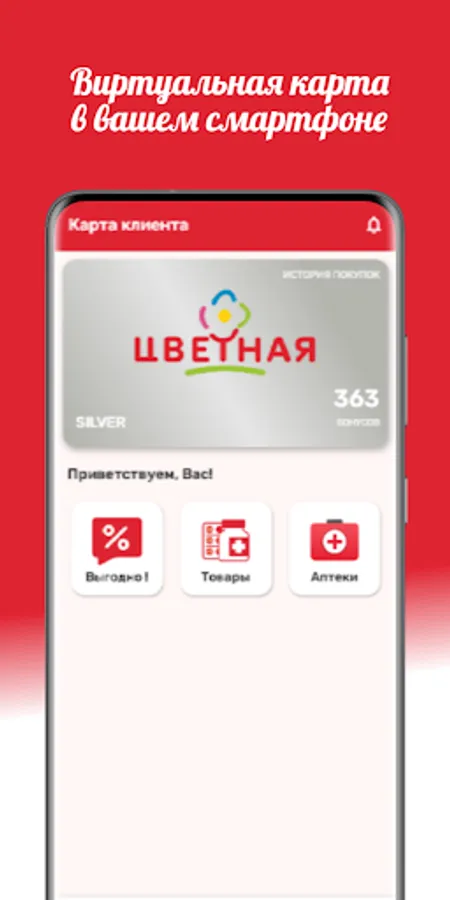 Loyal customer card of the Tsvetnaya pharmacy chain. A virtual loyalty card gives the right to participate in the loyalty program, allowing the client to receive bonuses and pay with them up to 100% of the cost of the goods; and also gives the client the opportunity to be the first to know about special offers and current promotions.