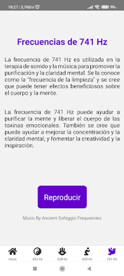 In Music to vibrate the Universe, you can listen to music in four different spiritual vibration frequencies: 432 Hz, 528 Hz, 639 Hz and 741 Hz. Each vibration frequency has its own effect on our body and mind, and you can choose the one that best suits your needs. Whether you want to relax, meditate or just enjoy music, you'll find the perfect frequency for you.