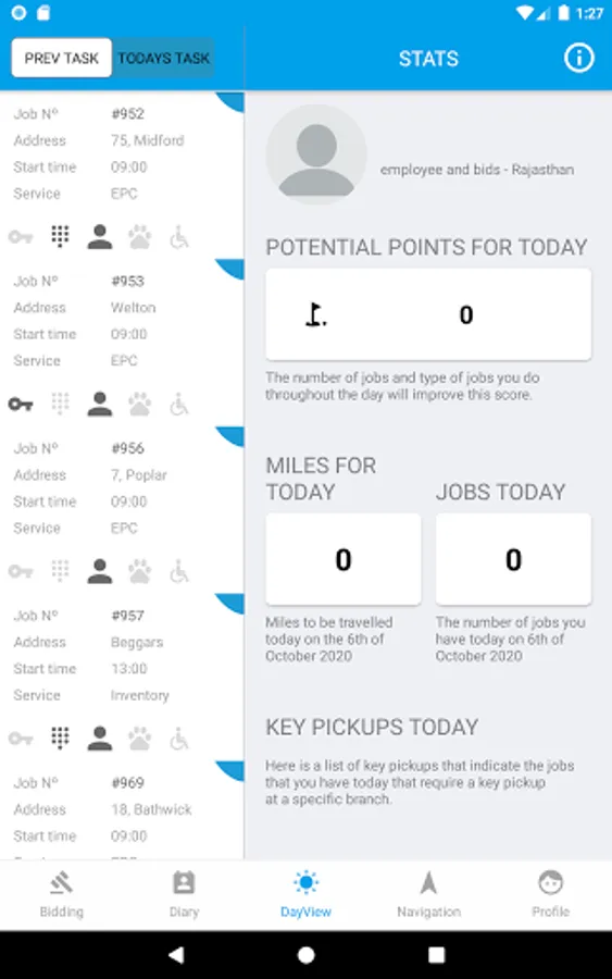 DayView, where daily tasks can be managed, displaying information about jobs to be carried out by the assessor. The Diary View displays the assessor’s forward and past diary including details about the appointments. Additionally there is the Bidding screen which displays available jobs and allows assessors to accept the jobs, and finally there is a Profile section displaying information and settings about the Assessors profile and giving the ability for assessors to request time off and notify of sickness. The application has an interface with Evolve Web App which provides the mobile app with data, and also allows the assessor to download previous reports as well as update the web app of status changes and other changes / updates from the mobile application. Push notifications are sent from the web application to the mobile application.