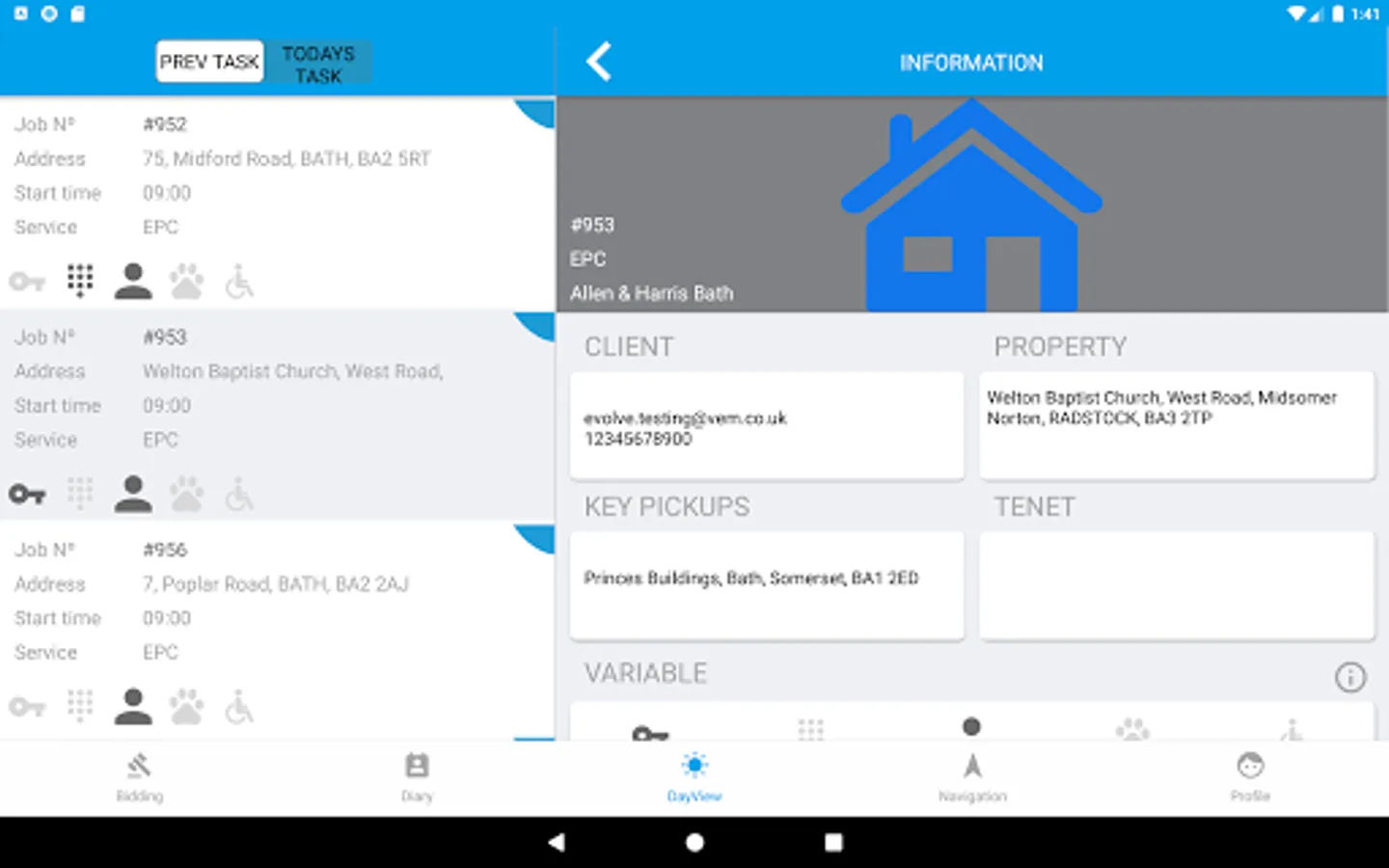 This mobile application is a daily task and diary management solution for UK wide field based assessors that carry out property services reports and energy performance certificates for UK based clients on behalf of Vibrant Energy Matters. The app consists of a number of features including the
