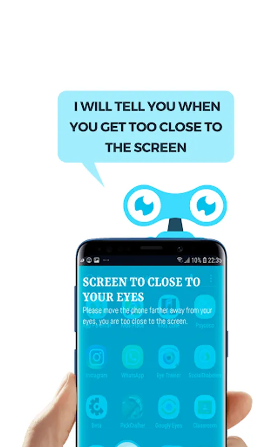 5 - Eyesapp works in the background, continuously controlling the distance between the eyes and the screen, it will interrupt the activity when it is less than 30 cm until the safety distance is recovered.