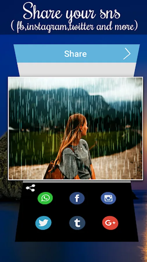 Rain Photo video maker is collection of beautiful rain photo effects. Use any photo frame and make amazing rainy image.