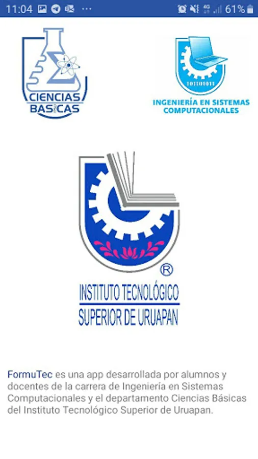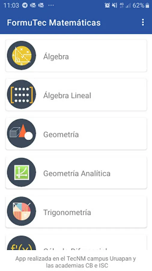 FormuTec Mathematics is an application that is aimed at students of the technological community of the Higher Technological Institute of Uruapan (ITSU), and for all those institutions where it can be applied as in other universities or high schools that take subjects related to exact sciences. Its objective is to offer a vast range of math formulas and some other tools that facilitate your activities when performing calculations in your respective subjects.