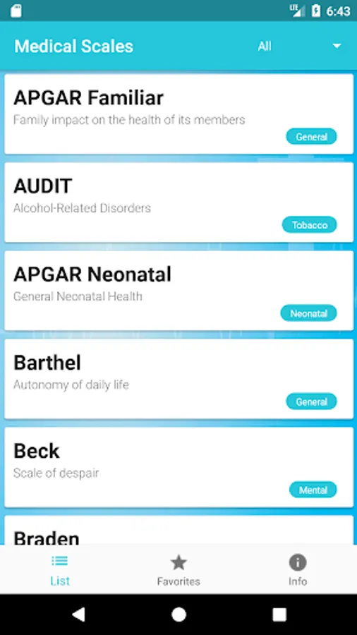 They are ordered by categories such as Neonatal, Surgical, Tobacco, Alcohol among others. And you can make your list of favorites with the ones you use the most.