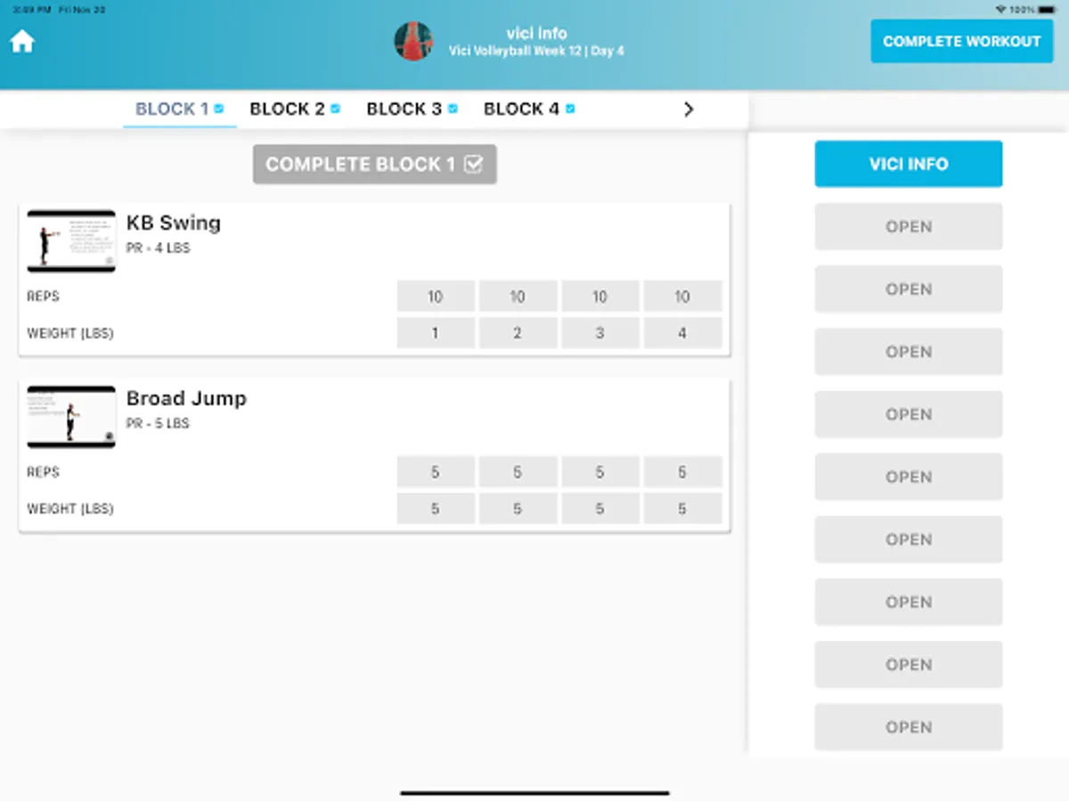 Finally! No more paper workout folders. The Vici Performance app is an in house/in gym solution that allows you to train groups or individuals and track their metrics via tablet. The app automatically populates the next day's workouts, and athletes receive their results immediately through the companion app.