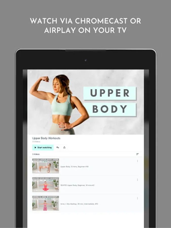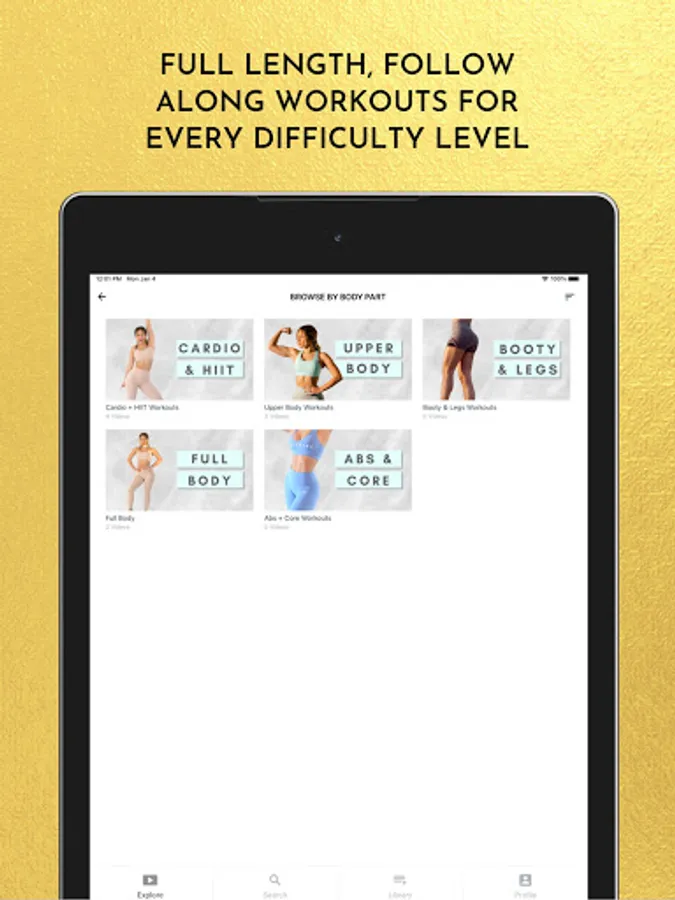 Browse workouts organized by time (ranging from 10 mins to 1 hour +), difficulty level, or body part.