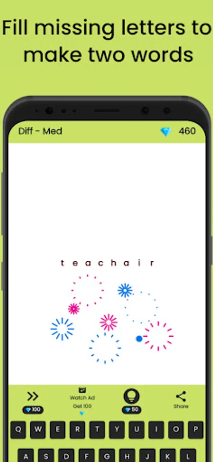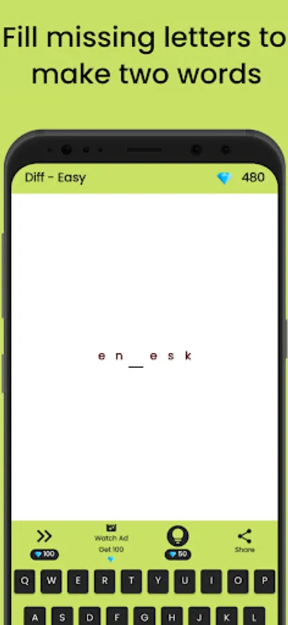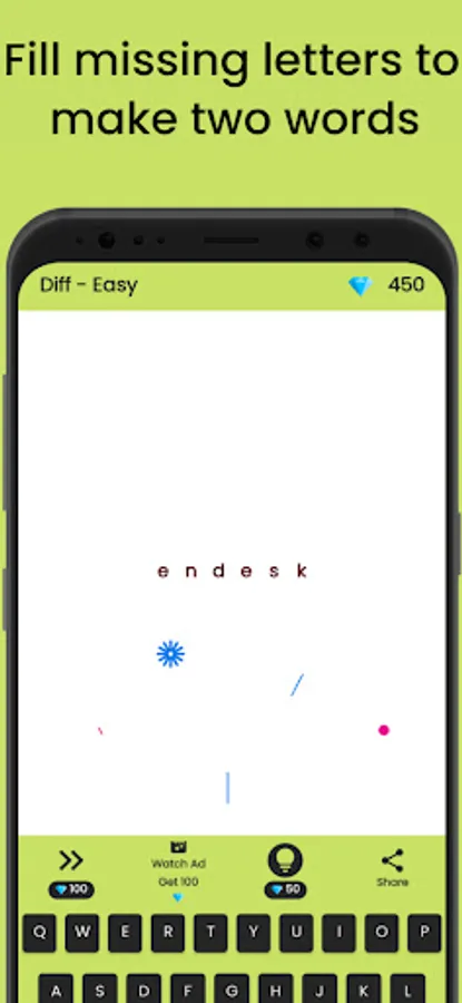 How to play: Each level has an incomplete word with some incomplete letters . Place missing letters so that these finish the word on the left and start the word on the right