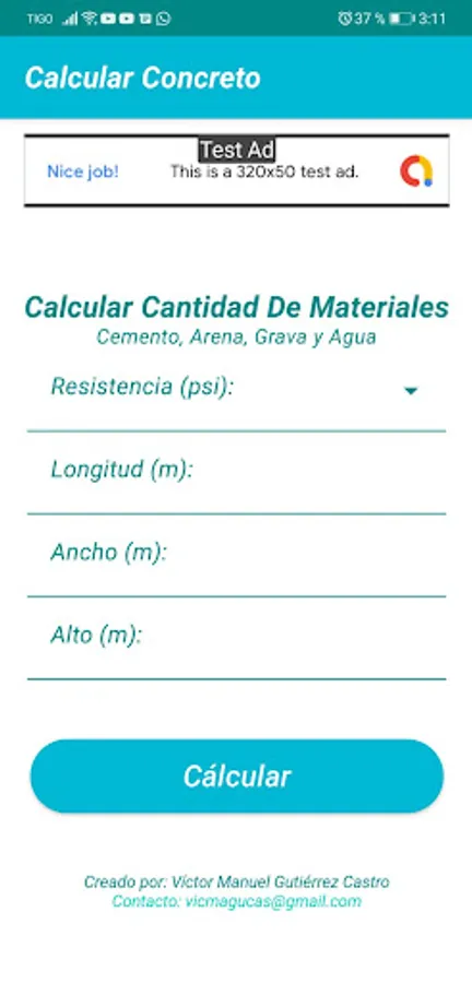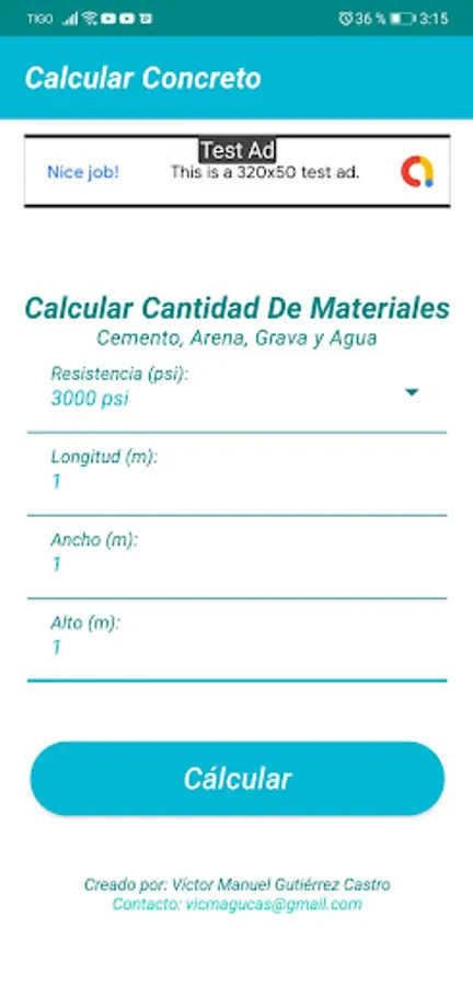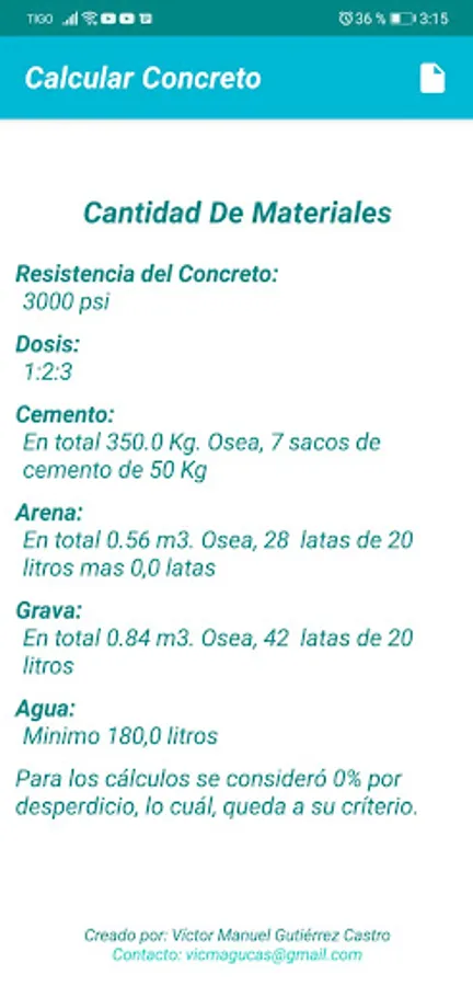 This App is a basic tool for builders and amateurs, which allows you to calculate the amount of materials such as sand, cement, gravel and water according to the strength and/or dosage of the concrete; necessary in the elaboration of a given volume of concrete, based on its dimensions: width (front), length (depth) and height (thickness). Applicable to volumes with rectangular or square edges such as: a concrete plate, a square section column, beam, slab, etc.